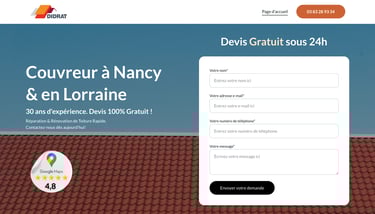Landing page sur mesure pour une entreprise de couverture. Mise en avant stratégique du formulaire de contact dès la page d'accueil.